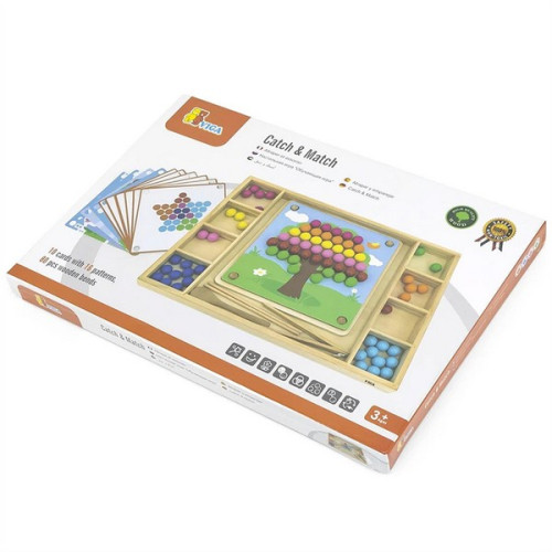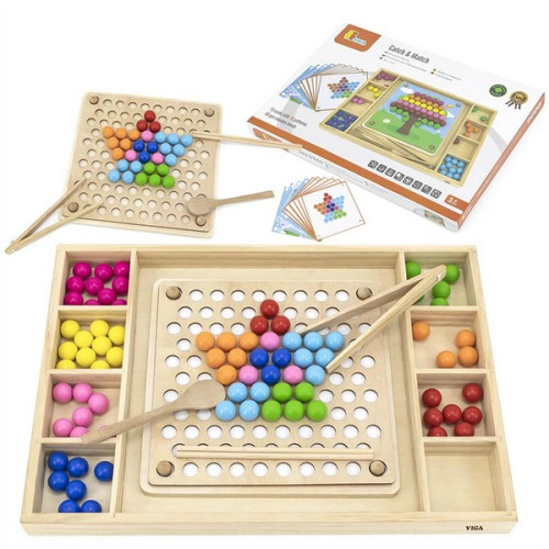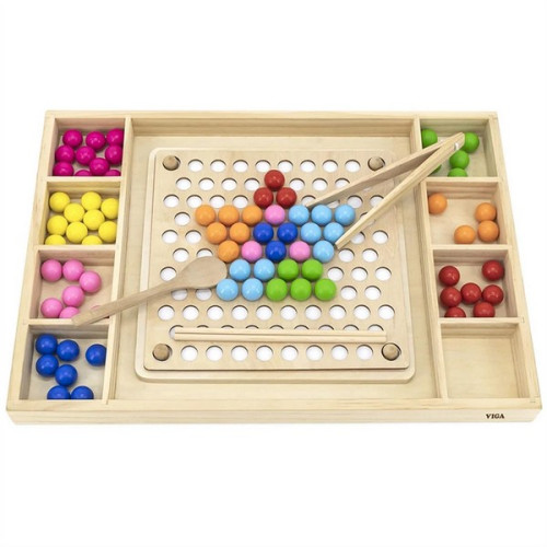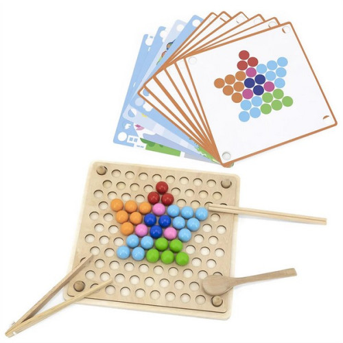 A wooden box with its gridded bead holes, acts as a storage container for the buttons and activity cards inside, as well as the play surface itself.