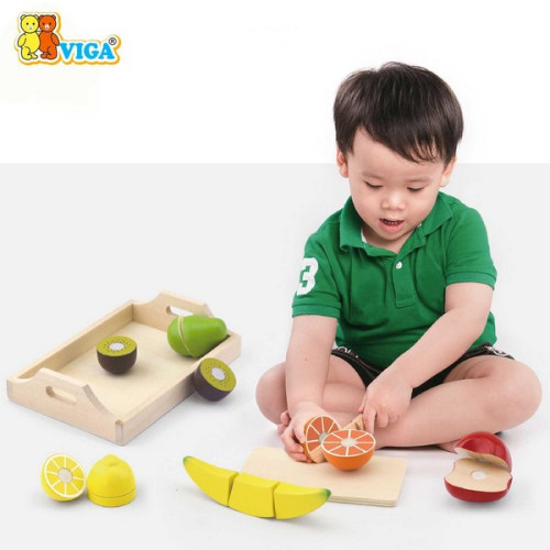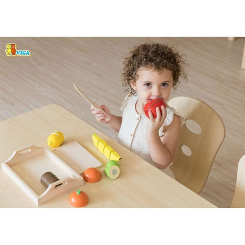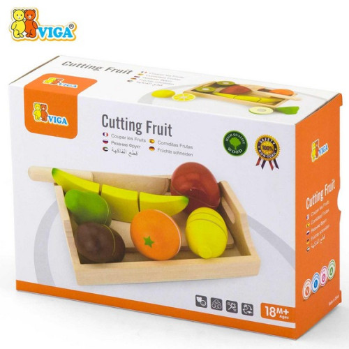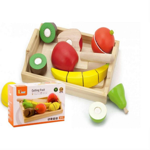 Timeless fun with wooden food play set. Tray, knife, fruit pieces for cutting and reassembly. Age 3+