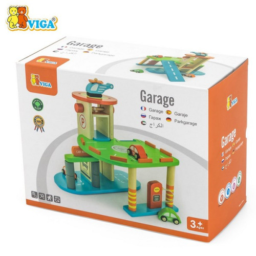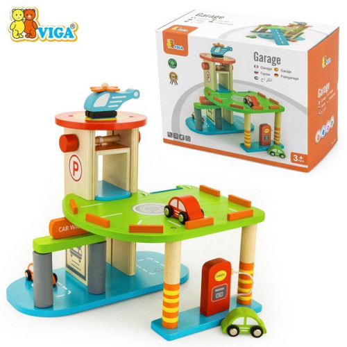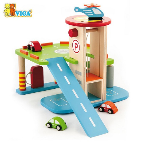 Two-level wooden parking garage with gas station, car wash, elevator, 3 cars, and 1 helicopter. Encourages creative play and motor skills.