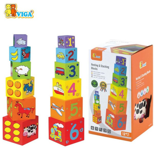 This item contains 6 colorful wooden blocks printed by hand with animals, vehicles, fruits and numbers which can be stacked and nested. Age 3+