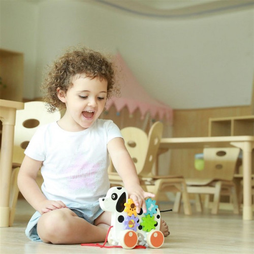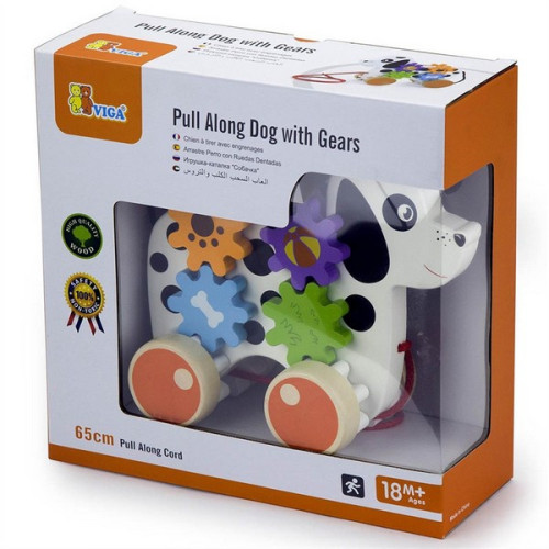 Colorful, eco-friendly pull along dog with removable gears for motor skill development. Non-toxic, safe for children.